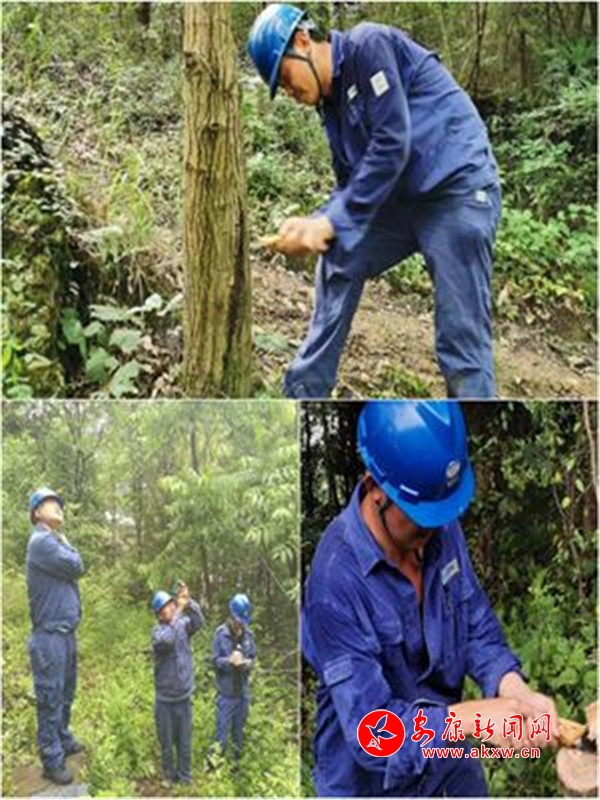 在悶熱難耐的綠樹(shù)山林間,他們頭戴藍(lán)色的安全帽,身著長(zhǎng)袖長(zhǎng)褲的工作服,不停揮舞著砍刀、電鋸,背上被浸濕的水跡,已分不清是汗水還是雨水,木屑飛舞,刀起刀落,伴隨著“轟轟轟……”的聲音,一顆顆超高樹(shù)木倒下,一條條線路通道暢通了。這不辭辛勞、團(tuán)結(jié)合作的工作場(chǎng)景幾乎每天都能在山林里看到。