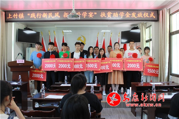 在升學(xué)禮上,宣讀了《上竹鎮(zhèn)2020年度“踐行新民風(fēng)•不辦升學(xué)宴”教育扶貧助學(xué)活動(dòng)實(shí)施方案》,按照一本2000元,二本1500元的標(biāo)準(zhǔn)為18學(xué)生發(fā)放了扶貧助學(xué)金,共計(jì)30500元。學(xué)生代表印想想發(fā)言,她表示,堅(jiān)決向“升學(xué)宴”“謝師宴”說(shuō)不,自己會(huì)更加努力學(xué)習(xí),不負(fù)眾望,知恩感恩,做文明新風(fēng)的倡導(dǎo)者。學(xué)生家長(zhǎng)代表陳昌瓊在儀式上發(fā)言,將一如既往地弘揚(yáng)新民風(fēng),自覺抵制大操大辦、鋪張浪費(fèi),做移風(fēng)易俗的踐行者。在活動(dòng)現(xiàn)場(chǎng),學(xué)生家長(zhǎng)也倍感自豪,臉上洋溢著幸福的笑容,紛紛表示,黨委政府通過(guò)開展新穎的慶祝活動(dòng),給孩子們留下珍貴的記憶,既達(dá)到了革除陋習(xí)的目的,讓“里子”好,又讓百姓“面子”亮。
