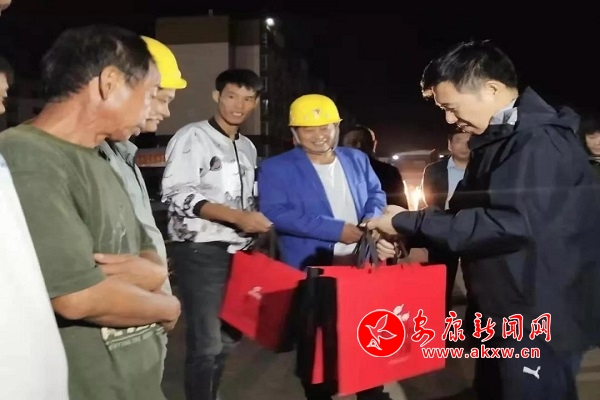 在深夜的施工現(xiàn)場,郭青向工人和基層干部送上了月餅等慰問品,對他們在中秋佳節(jié)期間依然堅(jiān)守工作崗位的敬業(yè)精神和舍小家顧大家的奉獻(xiàn)精神表示崇高敬意,叮囑大家一定要注意身體健康和夜間施工安全。