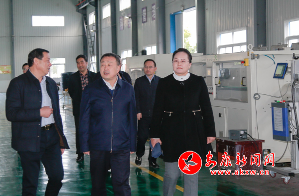 武文罡(右三)在漢陰縣中昌管業(yè)公司調(diào)研企業(yè)生產(chǎn)經(jīng)營情況