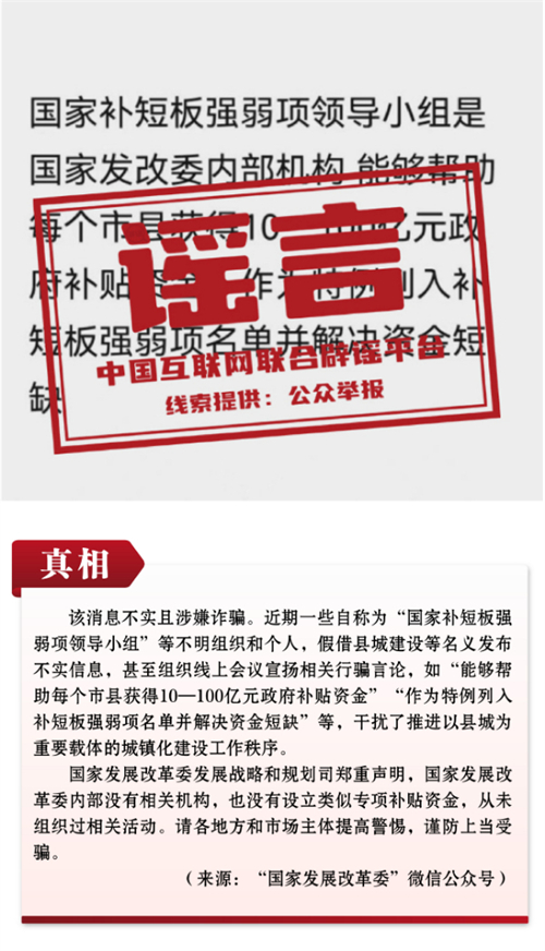 謠言2:有“國家補(bǔ)短板強(qiáng)弱項(xiàng)領(lǐng)導(dǎo)小組”并設(shè)立專項(xiàng)補(bǔ)貼?