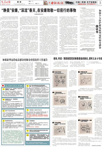 積極搭建民生服務(wù)平臺(tái),幫助群眾解決實(shí)際困難。2020年,本報(bào)堅(jiān)持正面宣傳,開設(shè)“眾志成城抗擊疫情”欄目,深入宣傳、充分報(bào)道黨中央重大決策部署、聯(lián)防聯(lián)控措施、防控疫情的成效,使全市群眾在堅(jiān)定信心的同時(shí),興起了群防群控?zé)岢。充分發(fā)揮服務(wù)群眾、引導(dǎo)群眾功能,先后開設(shè)“2020春我的宅家筆記”等欄目刊發(fā)稿件30多篇,引導(dǎo)市民不盲目跟風(fēng)不過度防護(hù),有效及時(shí)疏導(dǎo)公眾焦慮恐慌等情緒,凸顯了主流媒體的傳播力影響力和公信力。