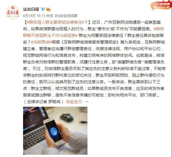 日前,廣州互聯(lián)網(wǎng)法院通報(bào)一起典型案例,如果微信群里出現(xiàn)罵人的行為,群主“慢作為”或“不作為”可能要擔(dān)責(zé)。