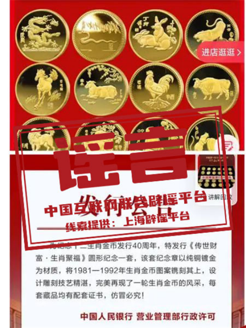 真相:“為紀(jì)念十二生肖金幣發(fā)行40周年,特發(fā)行《傳世財(cái)富·生肖聚!穲A形紀(jì)念章一套”“一次性收齊央行十二生肖紀(jì)念幣”……直播間里的各種“紀(jì)念幣”,有的甚至帶有“央行發(fā)行公告”等“紅頭文件”,讓人真假難辨。經(jīng)上海網(wǎng)信部門調(diào)查發(fā)現(xiàn),上述網(wǎng)傳商品與央行發(fā)行的紀(jì)念幣有著天壤之別。很多商家故意混淆“紀(jì)念章”與“紀(jì)念幣”、“央行圖樣許可”與“央行發(fā)行”的區(qū)別,誤導(dǎo)公眾。事實(shí)上,“紀(jì)念幣”由央行發(fā)行,分為普通紀(jì)念幣與貴金屬紀(jì)念幣,“紀(jì)念章”則是商家自行設(shè)計(jì)制造的,與央行沒有關(guān)系;而“圖樣行政許可”只是表示央行同意相關(guān)單位在產(chǎn)品上使用人民幣圖樣,并不代表產(chǎn)品由央行發(fā)行。對(duì)公眾來說,想要分辨是“央行發(fā)行”還是“商家生產(chǎn)”,一是可以通過央行官網(wǎng)查看每年發(fā)行的普通紀(jì)念幣和貴金屬紀(jì)念幣項(xiàng)目;二是看紀(jì)念幣或紀(jì)念鈔是否有面額和貨幣單位,其中貨幣單位為“元”。(來源:“上海網(wǎng)絡(luò)辟謠”微信公眾號(hào))