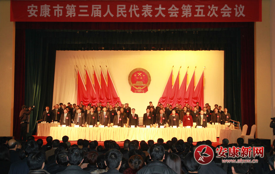全體人員起立高唱國(guó)歌,安康市第三屆人民代表大會(huì)第五次會(huì)議勝利閉幕!