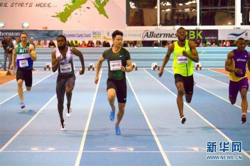 ↑2月13日,中國(guó)選手蘇炳添(中)在預(yù)賽中沖刺。 當(dāng)日,在愛(ài)爾蘭阿斯隆舉行的室內(nèi)大獎(jiǎng)賽中,中國(guó)短跑名將蘇炳添以6秒52的成績(jī)?cè)谀凶?0米比賽中奪冠并打破賽會(huì)紀(jì)……