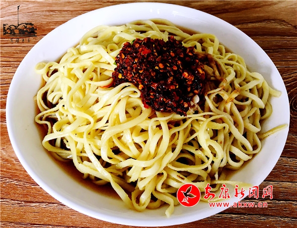在恒口,涼面作為大眾面食,家里來了客人,主婦都會(huì)做涼面招待。搟一案子面,切成筷子寬的長條,下鍋煮開就撈,滴上香油,快速挑起用扇子扇涼,配上幾個(gè)可口的素菜就齊活了。醋湯、油潑辣子、青辣大蒜,還有花生碎。雖然調(diào)料不多,但每一樣都很講究。醋汁需用十幾種大料熬制,要保證每次熬出的醋湯味道一致,大料要精確比例。油潑辣子要選用上等干辣椒,炕干再配上調(diào)料打碎。每一樣精心調(diào)制的配料要達(dá)到色香味俱全,構(gòu)成了傳統(tǒng)涼面的精髓。
