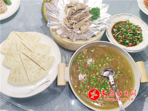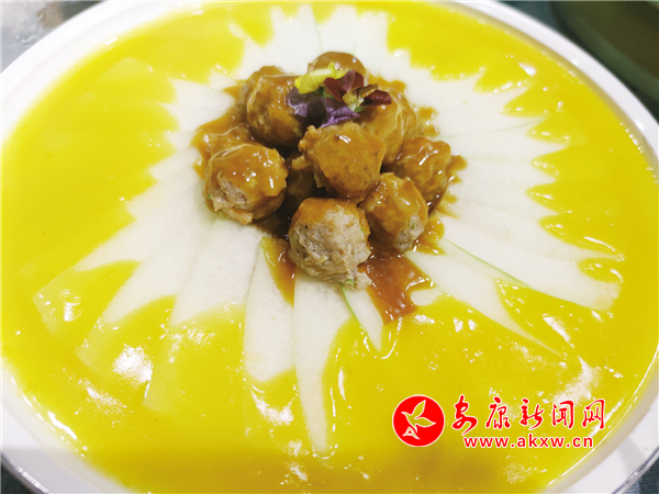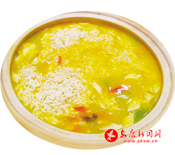 這是一道舌尖美味,制作時(shí)提前把海參、青筍、杏鮑菇、紅蘿卜切好汆水,備好墨魚花、蝦仁、棒骨高湯、南瓜泥、咸蛋黃,炸好香米,客人餐前,把炸好的香米復(fù)炸香脆裝盤,再把雞油、咸蛋黃、高湯和南瓜泥放入鍋內(nèi)翻炒,然后倒入海參、青筍、杏鮑菇、紅蘿卜、墨魚花、蝦仁等食材,燒開勾芡,調(diào)制成濃香金湯,起鍋裝盆,端到客人餐桌,當(dāng)著食客的面將脆米倒入盛裝金湯的土盆里,攪拌均勻即可。這道菜看著五顏六色、金黃油亮,吃著養(yǎng)胃養(yǎng)顏,湯汁鮮美,營(yíng)養(yǎng)豐富。