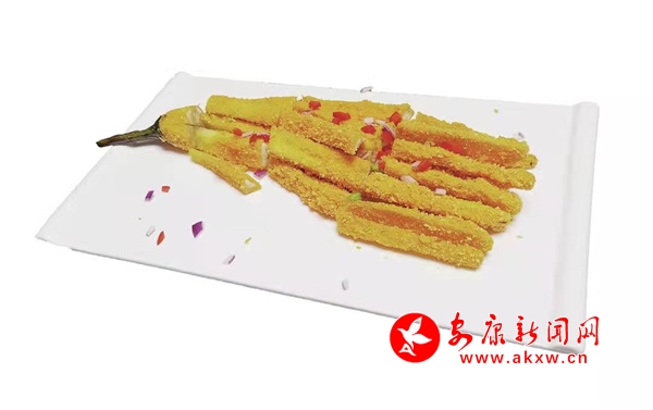 推薦理由:這道菜選用長(zhǎng)形的紫氣皮茄子,削皮后橫豎刀切成佛手狀的粗條,均勻給每一根茄條拍上調(diào)味后的干淀粉、抹上雞蛋液,再裹上一層面包糠,下油鍋炸至表皮金黃,切成長(zhǎng)短適合入口的大小,點(diǎn)綴上洋蔥碎和辣椒丁便可擺盤上桌了。菜品顏色金黃燦爛,看一眼便讓人食欲大開,夾一塊送入嘴中,外皮酥脆化渣,內(nèi)部是茄肉的軟嫩多汁,茄子的香味透過面包糠的油香層層滲入口腔,余味悠長(zhǎng),是一道老少皆宜的美味佳肴。