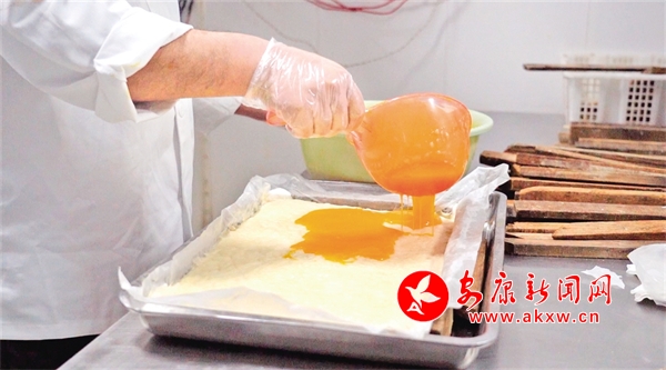 白河肉糕的選材極為講究,以七分肥三分瘦的優(yōu)質(zhì)豬肉、雞蛋、淀粉等為主要原材料,輔以蔥姜等天然香辛料。將豬肉放在展板上用木槌搗成泥后加水?dāng)嚢杈鶆,再與蛋清、淀粉等按比例調(diào)和。隨后把蘿卜切成條塊,在蒸籠里擺成長(zhǎng)方形模具狀,填入搗好的肉泥,蒸上十分鐘;待初定型后,去籠,往肉糕上均勻涂抹蛋黃,每蒸五分鐘涂抹一次;三次過(guò)后,正宗的肉糕就做成了。