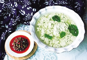 兩摻面,一半豆面與一半麥面在漢江水的調(diào)和下,經(jīng)過(guò)反復(fù)搓揉摻搟,兩種面粉化作一種新的食材——兩摻面。兩摻面摻好后醒的過(guò)程中,從酸菜壇子里撈出清……