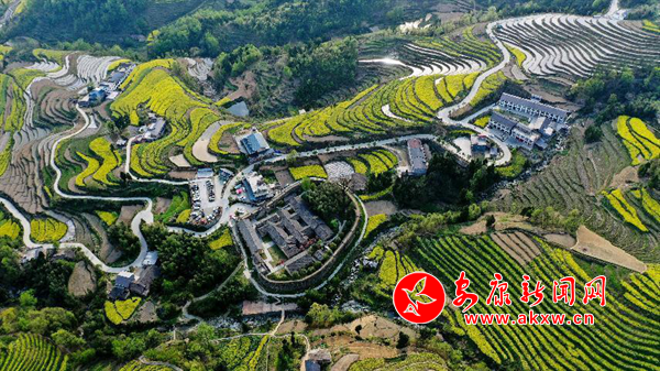 三三兩兩的房屋,就掩映在層疊的菜花梯田間,潔白的墻面,黛青的屋瓦,金燦的菜花,有種遺世獨立的靜美,塵世的喧囂一下子就遠了。尋一條鄉(xiāng)野小徑,步入茫茫花田間,不時有蜂蝶流連,孩童嬉鬧,農(nóng)人牽著牛自不遠的長橋上悠悠走過,處處都流淌著鄉(xiāng)村田園的盎然春意。