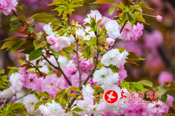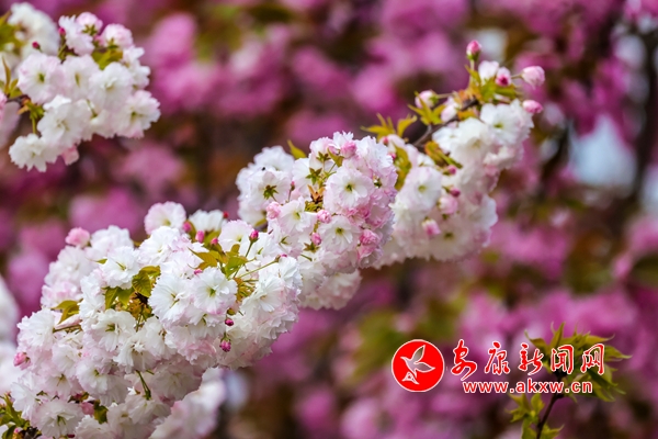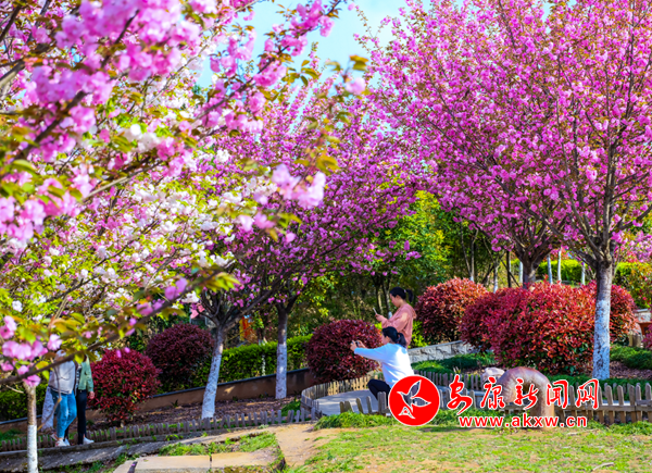 近日,在漢陰縣龍崗公園,成片櫻花競相開放,形成一片紅粉為主、白色點綴的爛漫花海,蔚為壯觀。