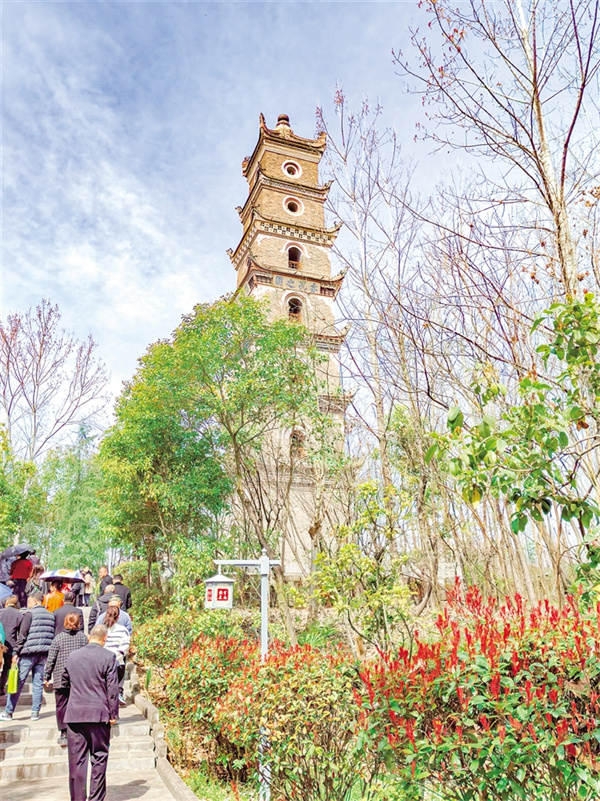 這時(shí),塔側(cè)傳來(lái)歡快的鑼鼓聲,循聲望去,是一段十幾米的孝義文化長(zhǎng)廊,一組男女或站或坐敲打著響器,使奠安塔不再寂寞。廊道的另一頭連接著奠安公園,環(huán)形觀景步道上擠滿了游覽的人。春分時(shí)節(jié),杏花正在萌發(fā),桃花含苞待放,倒是紅葉李花開正艷,細(xì)小如甲的花瓣布滿枝頭,零落軟泥上,雪白一片,仿佛成了李花的世界。舉目四望,花草清新,小學(xué)生在撿拾垃圾,胸前的紅領(lǐng)巾在陽(yáng)光的照射下熠熠生輝,與周遭綠植映襯,絢爛了滿園春色。