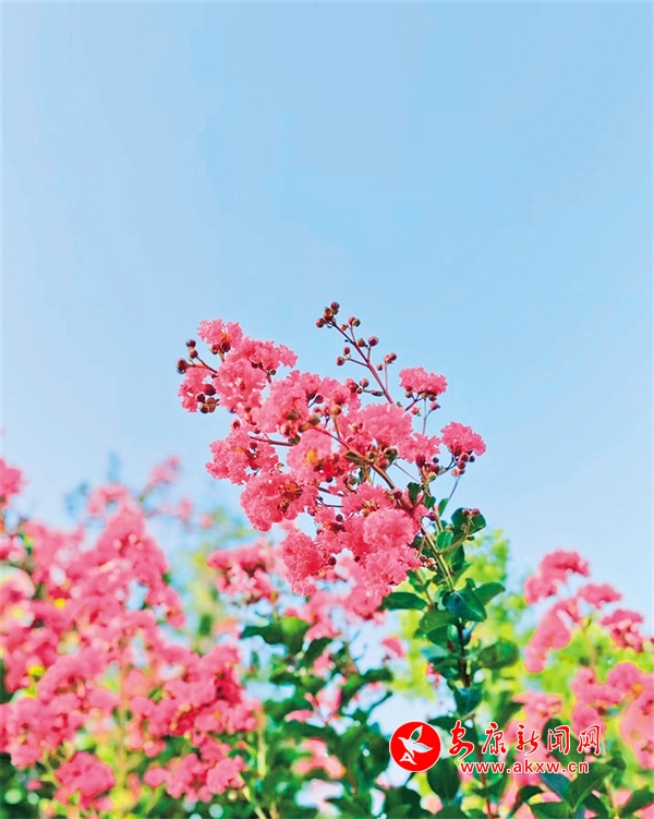 “獨(dú)占芳菲當(dāng)夏景,不將顏色托春風(fēng)!碑(dāng)上百株紫薇花在鳳凰山里絢爛枝頭時(shí),我與它們?cè)诖竽蠝舷嘤觥!?/div>