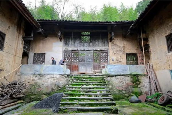 經(jīng)天井院上九步石梯到長廊,此廊為石栓石欄。正面堂屋為六開槅扇門,門窗為土木雕刻工藝,國文壽字,古銅錢、蝙蝠、冬瓜圈、梭子圈、卷草等工藝。此處為黃家紙廠議事之地,巧借地勢突出氣勢,雖只兩層,卻與兩邊三層廂房等高,借助前面的大天井采光,構成院中府第,顯然是吸取了湖廂府衙式建筑理念。從堂屋前的過道可通往東西兩側小天井,面向大門,西側小天井因地勢縮進2米,但建有曬樓(陽臺),雖然天井狹小,但天井里鑿內(nèi)池、留溝防、設路徑、安石碑,甚至連置盆栽種都應有盡有,雖然時光侵蝕,破損嚴重,但遺跡清晰可辨,足見主人生活饒有情趣。