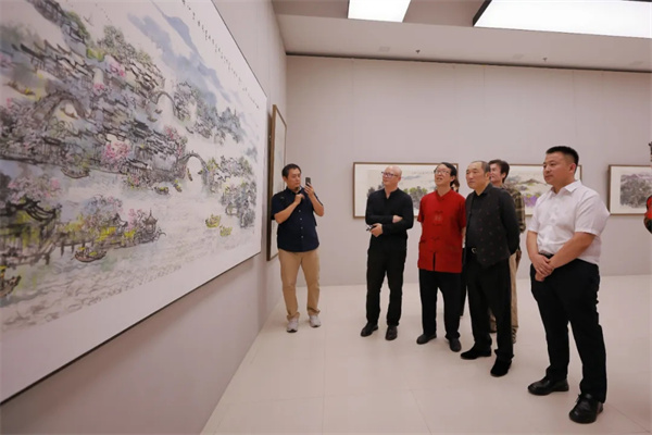 于洋在致辭中表示,“王福元先生的作品之所以被觀者所認(rèn)同,被畫壇所稱道,正是源于他對藝術(shù)的執(zhí)著態(tài)度,及其作品顯現(xiàn)出的鮮明藝術(shù)特色和濃郁的個人風(fēng)格。其作品的個人特色主要體現(xiàn)在三個方面:其一,王福元先生長于色彩,并獨(dú)創(chuàng)‘幻彩’畫法。他不囿于傳統(tǒng)山水畫色彩的固有程式,其作品色彩鮮活、生動清透,筆下的江南山水玲瓏剔透、氤氳朦朧,同時色彩絢爛,極具觀賞性,作品色彩張力和視覺沖擊力強(qiáng);其二,王福元先生的山水畫具有綜合跨界性,借鑒了繪畫領(lǐng)域外其他藝術(shù)門類的風(fēng)格。王福元先生長于音律,能演奏笛、蕭等樂器,因此他的山水畫有以音律入畫、注重意蘊(yùn)表達(dá)的特點(diǎn),具有很強(qiáng)的節(jié)奏感和律動感。其三,他的山水畫具有很強(qiáng)的筆墨、色彩、圖式的個人特點(diǎn)。與北方山水不同,江南山水因其獨(dú)特的地域性,具有一派平遠(yuǎn)的景象。他把個人思考和表現(xiàn)風(fēng)格化育在清透的江南文人水鄉(xiāng)氣象之中,在承續(xù)傳統(tǒng)文脈的同時也顯現(xiàn)了地域文化性格,這是十分可貴的。正因?yàn)檫@三個方面的特點(diǎn),我覺得王福元先生筆下的江南山水既是南派山水畫自古以來變遷中的一種發(fā)展,也是他通過自身的綜合思考和知行合一的積淀所衍生出來的個人風(fēng)格。”。