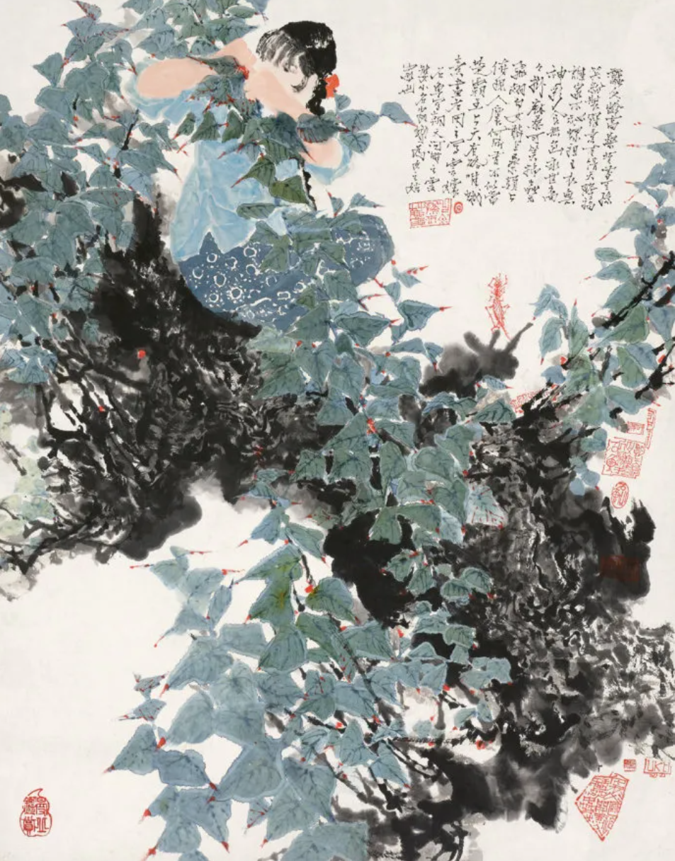 題識:蠶女齡喬桑,昔有王孫笑粉妝。羅素有情天降福,誰家不秘王祖。衣無神采食無魚,永世商裔掛麻桑?尚γ尴x無飛翅,白女敢上桑顛上。俯視人寰何所有,不似當(dāng)(年)楚霸王。上天有路唯蛾素,畫者因之寫云。石魯寫朝天河畔之云婆,小名安蛾,為女之姑家也!恫缮D》,2010春拍成交價1064萬元。